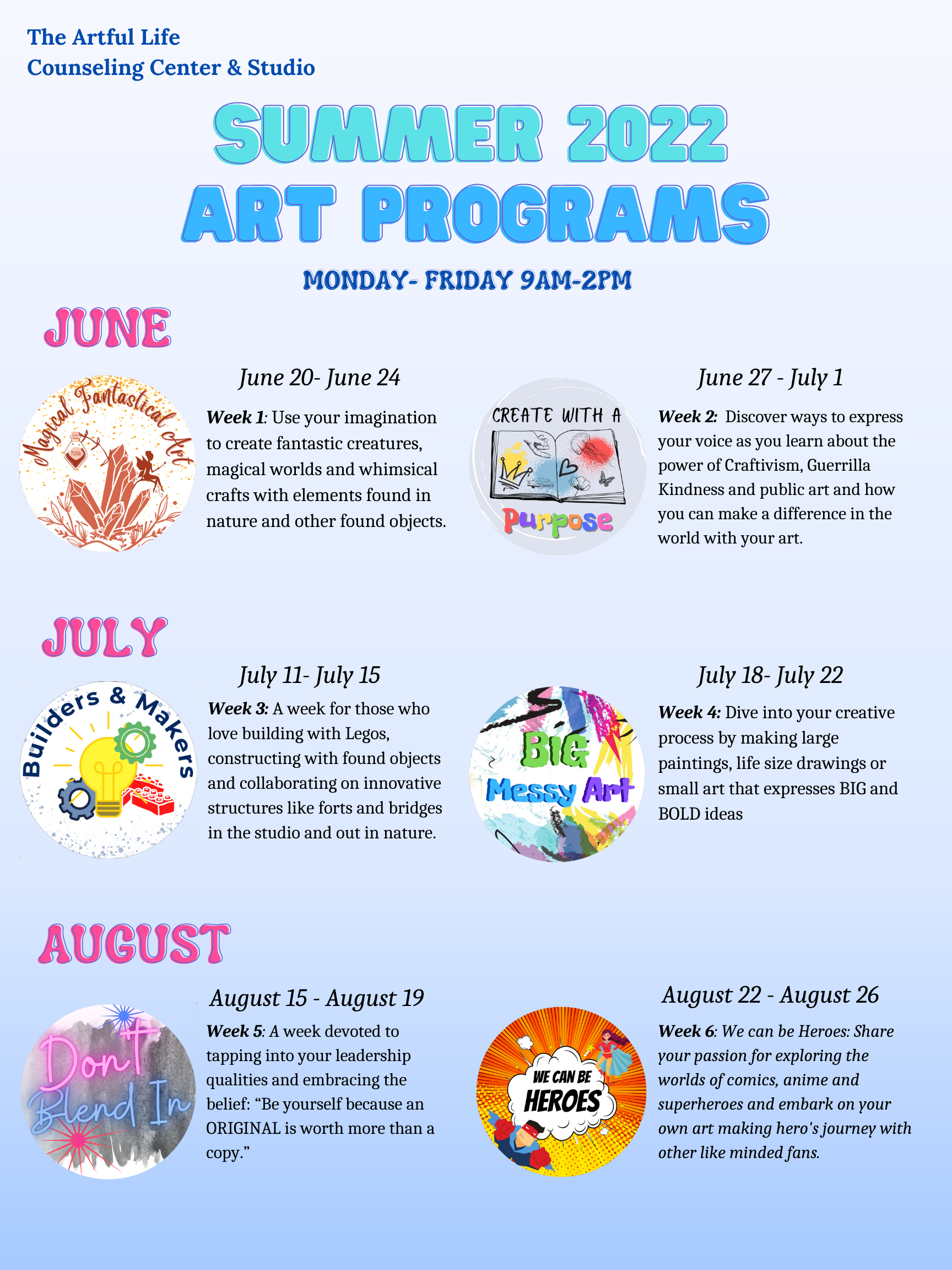 Social-emotional focus - While our programs are not therapy, our staff are trained, Master’s level professionals in using the arts to promote growth mindset, resiliency and emotional awareness.